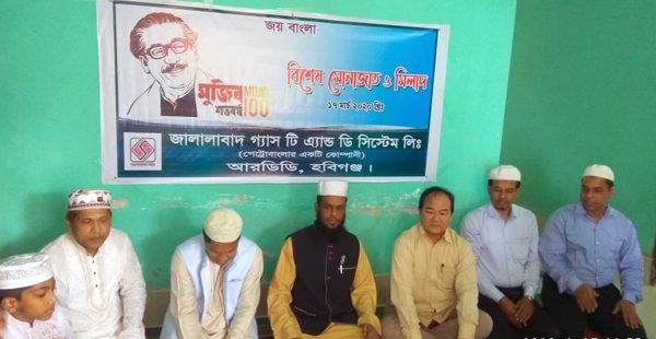 স্টাফ রিপোর্টার ॥ জাতির পিতা বঙ্গবন্ধু শেখ মুজিবুর রহমানের জন্মশত বার্ষিকী ও জাতীয় শিশু দিবস পালন করেছে জালালাবাদ গ্যাস টি এন্ড ডি সিস্টেম লিমিটেড। মঙ্গলবার দুপুরে হবিগঞ্জ আঞ্চলিক বিতরণ কার্যালয়ে দোয়া ও মিলাদ মাহফিলের আয়োজন করা হয়। অনুষ্ঠানে প্রধান অতিথি ছিলেন, জালালাবাদ গ্যাস টি এন্ড ডি সিস্টেম লিমিটেড আরডিডি হবিগঞ্জ এর উপ-মহাব্যবস্থাপক হবিগঞ্জের কৃতি সন্তান