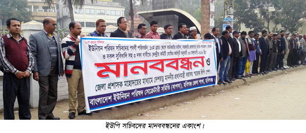স্টাফ রিপোর্টার \ ইউনিয়ন পরিষদ সচিবদের চাকুরী ১০ম গ্রেডে উন্নীতকরনসহ ৩ দফা দাবীতে হবিগঞ্জে অনুষ্ঠিত হয়েছে মানববন্ধন কর্মসুচী। বাংলাদেশ ইউনিয়ন পরিষদ সেক্রেটারী সমিতি বাপসা হবিগঞ্জ ইউনিট বুধবার শহরের দুর্জয়ের সামনে এ মানববন্ধন কর্মসুচী পালন করে। প্রায় ১ ঘন্টা ব্যাপী এ মানববন্ধনে হবিগঞ্জের বাপসা সভাপতি মোঃ নূরুল হুদা চৌধুরী সভাপতিত্বে বক্তব্য রাখেন, হবিগঞ্জ জেলা চেয়ারম্যান সমিতির
