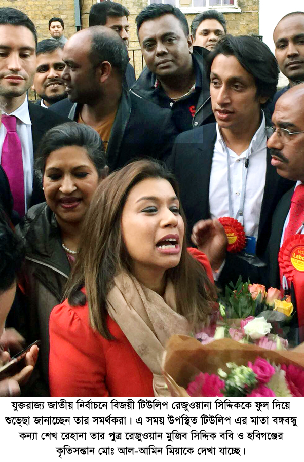 বিজয়ের মধ্য দিয়ে ব্রিটিশ পার্লামেন্টে বাংলাদেশিদের অভিষেক ঘটে। এবারে তিনি আর একা নন। সঙ্গে যুক্ত হয়েছেন আরো দুইজন সাহসী বঙ্গকন্যা। এর মধ্যে রয়েছেন জাতীর জনক বঙ্গবন্ধু শেখ মজিবুর রহমানের কন্যা শেখ রেহেনার মেয়ে ও বাংলাদেশের প্রধানমন্ত্রী শেখ হাসিনার ভাগ্নী টিউলিপ রেজওয়ানা সিদ্দিক। আরেক সাহসী কন্যা শিক্ষিকা ড. রূপা আশা হক। রুশনারা আলীর জন্ম সিলেটের বিশ্বনাথে। গতবার পূর্ব লন্ডনের বেথনাল গ্রিন অ্যান্ড বো আসনে প্রায় ১২ হাজার ভোট বেশি পেয়ে তিনি বিজয়ী হন। এবারও একই আসনে লড়েছেন তিনি। জয় পেয়েছেন ৬১ শতাংশ ভোট পেয়ে। তার নিকটতম প্রতিদ্বন্দ্বী পেয়েছেন মাত্র ১৫ শতাংশ ভোট। যা দেখে বলা যায় রুশনার কাছে পাত্তাই পায়নি প্রতিদ্বন্দ্বী নেতা স্মিথ। লেবার পার্টির হয়ে টিউলিপ রেজওয়ানা সিদ্দিক ৪৪ শতাংশ ভোট পেয়ে নির্বাচিত হয়েছেন হ্যাম্পস্টেড অ্যান্ড কিলবার্ন আসন থেকে। ২৩ বছর ধরে লেবার পার্টির দখলে রয়েছে এ আসনটি। কিন্তু ২০১০ সালের পার্লামেন্ট নির্বাচনে লেবারদলীয় প্রার্থী গ্লেন্ডা জ্যাকসন অনেকটা হারতে হারতেই মাত্র ৪২ ভোটে জিতে যান এ আসনে। এ কারণেই ক্ষমতাসীন কনজারভেটিভ পার্টি এবার এ আসনটিকে টার্গেট সিট বানিয়েছিল। কিন্তু না এ আসনে বঙ্গবন্ধুর নাততি টিউলিপ শক্ত হাতে হাতল ধরেন। ফলে হাজার ভোটের ব্যবধানে প্রতিপক্ষ দলের প্রার্থী মার্কোসকে পেছনে ফেলে জয় ছিনিয়ে আনেন তিনি। এ আসনটি ব্রিটেনের দ্বিতীয় সর্বোচ্চ বাঙালি অধ্যুষিত। তবে জয় যত সহজে বলা যায় টিউলিপের জন্য বিষয়টা তত সহজ ছিল না। মা শেখ রেহানা হয়তো গর্বের সঙ্গেই বলবেন, তার মেয়ে টিউলিপের এ পর্যন্ত আসার পেছনে পারিবারিক রাজনৈতিক পরিচয় কোনো ভূমিকা রাখেনি। কিন্তু ঠিক ওই কারণেই স্বাধীন বাংলাদেশের স্থপতি বঙ্গবন্ধু শেখ মুজিবুর রহমানের নাতনি টিউলিপকে কিছু নোংরা রাজনীতির মুখোমুখি হতে হয়েছে। টিউলিপের খালা বাংলাদেশের প্রধানমন্ত্রী শেখ হাসিনার রাজনৈতিক প্রতিপক্ষ যখনই কোনো ছোটখাটো বিষয় সামনে এনেছে, তখনই তা লুফে নিয়ে সমালোচনায় মুখর হয়েছে ব্রিটেনের ডানঘেঁষা সংবাদমাধ্যমগুলো। সম্প্রতি রাশিয়ার প্রেসিডেন্ট ব্লাদিমির পুতিনের সঙ্গে একটি গ্র“প ছবি নিয়ে হৈচৈ এমনই একটি ঘটনা। তাই স্থানীয়দের মাঝে টিউলিপকে নিয়ে বাড়তি আগ্রহও দেখা যায় ভোটের আগে। যা বিজয়ে রূপ নেয়। অপরদিকে, লন্ডনের দ্বিতীয় সর্বোচ্চ প্রতিদ্বন্দ্বিতাপূর্ণ আসন ইলিং সেন্ট্রাল অ্যান্ড অ্যাকট। এ আসনে গতবার তিন হাজার ৭১৬ ভোটের ব্যবধানে বিজয়ী হন কনজারভেটিভ দলীয় প্রার্থী এঞ্জি ব্রে। ২০১০ সালের নির্বাচনে এঞ্জি ব্রে পেয়েছিলেন ১৭ হাজার ৯৪৪ ভোট। ১৪ হাজার ২২৮ ভোট পেয়ে দ্বিতীয় হয়েছিলেন লেবার দলের প্রার্থী। ত