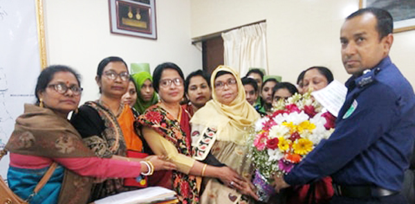 পরে পুলিশ সুপার মোহাম্মদ উল্ল্যাকে ফুলেল শুভেচ্ছা হবিগঞ্জ নার্সিং ইন্সট্টাক্টর রেহেনা খাতুন, রাজিয়া বেগম, কল্পনা ঝরাসহ শিক্ষক ও শিক্ষার্থীরা। (নিচে)