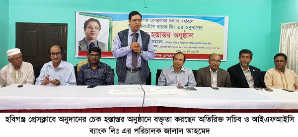 গতকাল শুক্রবার সকালে হবিগঞ্জ প্রেসক্লাবের কল্যাণ তহবিলে আইএফআইসি ব্যাংক লিঃ এর ৫ লাখ টাকা অনুদানের চেক হস্তান্তর অনুষ্ঠানে প্রধান অতিথির বক্তব্যে তিনি এসব কথা বলেন। হবিগঞ্জ প্রেসক্লাব সভাপতি হারুনুর রশিদ চৌধুরীর সভাপতিত্বে ও সাধারণ সম্পাদক সৈয়দ এখলাছুর রহমান খোকনের পরিচালনায় চেক হস্তান্তর অনুষ্ঠানে বিশেষ অতিথি ছিলেন আইএফআইসি ব্যাংক লিঃ এর এক্সিকিউটিভ ভাইস প্রেসিডেন্ট ও ঢাকার ফেডারেশন শাখার ম্যানেজার হেলাল আহমেদ। বক্তব্য রাখেন হবিগঞ্জ প্রেসক্লাবের প্রতিষ্ঠাতা সভাপতি অ্যাডভোকেট মনসুর উদ্দিন আহমেদ ইকবাল, সাবেক সভাপতি যথাক্রমে শামীম আহছান, মোহাম্মদ শাবান মিয়া, মোঃ ফজলুর রহমান, মোহাম্মদ নাহিজ, বীর মুক্তিযোদ্ধা গোলাম মোস্তফা রফিক, প্রেসক্লাবের সহযোগী সদস্য বাদল কুমার রায়, সৈয়দ কামরুল হাসান, আইএফআইসি ব্যাংক লিঃ হবিগঞ্জ শাখার ব্যবস্থাপক জাহিদ হাসান, ব্রাহ্মণবাড়িয়া শাখার ব্যবস্থাপক আব্দুল কাইয়ূম চৌধুরী শাহীন। উপস্থিত ছিলেন সাবেক সাধারণ সম্পাদক চৌধুরী মোহাম্মদ ফরিয়াদ,